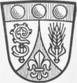 DE: Unter blauem Schildhaupt, darin nebeneinander drei goldene Kugeln, in Silber eine eingeschweifte blaue Spitze, darin eine goldene heraldische Lilie, beseitet rechts von der roten Krümme eines Abtstabes, links von einer roten Roggenähre.