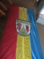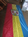 Fahne: Rot-Gelb-Blau mit aufgelegtem Wappen