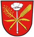 DE: In Rot eine senkrechte silberne Mohnpflanze, belegt mit einer goldenen Hanfpflanze und einer goldenen Gerstenähre in schräger Kreuzung.