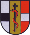 DE: Schild zweimal gespalten, vorne in Silber ein schwarzer Balken, hinten in Rot ein silberner Balken, in der Mitte in Gold ein senkrecht und waagerecht getrenntes schwarzes Hochkreuz mit roter Schlange.