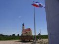 Fronleichnam 2021: eine Gemeindeflagge an Privathaus neben Kirche