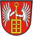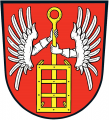 DE: In Rot zwei silberne Flüge mit jeweils nach innen wachsenden, bekleideten, silbernen Armen, die den Stiel eines senkrecht gestellten goldenen Rostes halten.