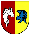 DE: Gespalten von Rot und Gold; vorne ein linksgewendeter silberner Pferdekopf, hinten ein blauer Römerhelm.