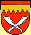 DE: In Rot über zwei gekreuzten silbernen Messern ein unten gekerbter goldener Balken.