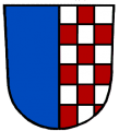 DE: Gespalten: vorne Blau, hinten geschacht von Rot und Silber.