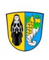 DE: Gespalten von Gold und Blau; vorne eine schwarz gekleidete Nonne mit goldenem Rosenkranz, hinten ein silbernes Füllhorn mit goldener Weintraube, goldener Birne und goldenem Apfel mit grünen Blättern.