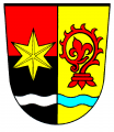 DE: Gespalten, unten belegt mit einem von Silber und Blau gespaltenen Wellenbalken; vorne geteilt von Rot und Schwarz mit einem aufgelegten sechsstrahligen goldenen Stern, hinten in Gold die rote Krümme eines Abtstabes.