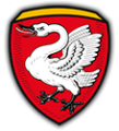 DE: In Rot ein schwarzbewehrter silberner Schwan mit gespreizten Flügeln.
