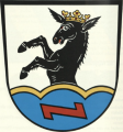 DE: In Silber ein aus einem golden gesäumten blauen Dreiberg wachsender, golden gekrönter schwarzer Esel; dem Dreiberg ist aufgelegt ein waagrechter roter Winkelhaken.