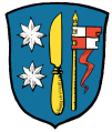 DE: In Blau ein durchgehendes, aufgerichtetes, nach links gekehrtes, goldenes Messer; rechts begleitet von zwei achtstrahligen silbernen Sternen, links: von einer von Silber und Rot gevierten, an den senkrechten Seiten zwei- bzw. einmal rechteckig ausgekerbten Fahne mit rotem Schwenkel, an goldener Lanze.