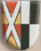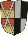 DE: Gespalten; vorne von Rot und Gold dreimal geteilt, belegt mit einem silbernen Schragen; hinten von Silber und Schwarz geviert.