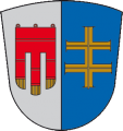 DE: Gespalten; vorne in Silber eine dreilatzige rote Fahne mit goldenen Fransen, hinten in Blau ein schwebendes goldenes Doppelkreuz.