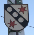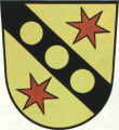 DE: In Gold ein mit drei goldenen Ballen belegter schwarzer Schrägbalken, beseitet von je einem sechsstrahligen roten Stern.